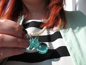 Il y a presque deux mois que j'ai acheté cette robe, et j'ai fort patiemment attendu pour la sortir du placard... Mais ça y est, les beaux jours sont là, à défaut d'avoir pu la mettre dans une version pinup au marché de la mode vintage comme je me le suis longtemps imaginé (merci l'entorse), je la mets pour aller au travail. Parce que c'est ça aussi la mode, son propre plaisir à s'habiller même simplement pour tous les jours :) J'ai bien évidemment été tentée de l'associer avec tous les accessoires jaune "néon" que j'avais en ma possession mais j'ai décidé de jouer la carte de ce cliché si vu et revu dernièrement pour un peu plus tard... Ainsi, mes stripes sont pastel ! Et pas n'importe quelle couleur pastel siouplait : du vert d'eau, aussi appelé menthe à l'eau ou mint. Isa, ne m'en veux pas, j'ai ressorti la fameuse veste... ainsi que quelques autres accessoires de la même couleur, mais toujours dans un esprit rétro ;)