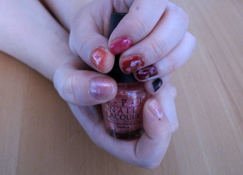 D'un côté, directement sur le durcisseur transparent, de l'autre, sur un dégradé noir/rouge/rose/corail pour vous montrer ce que ça donne. Désolée pour la qualité des photos, la seule chose que je reproche à l'automne et à l'hiver, c'est cette lumière bleue grisâtre peu flatteuse^^